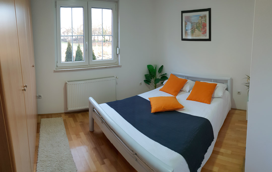 Prozračan i ugodan apartman uređen u bijelim i narančastim tonovima, opremljen sa svim potrebnim sadržajim. Osjetite udobnost vlastitog doma.